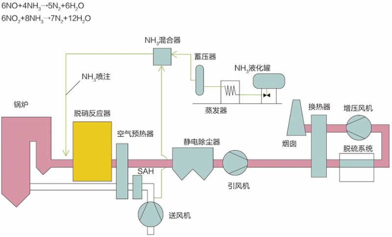 選擇性催化還原法(Selective Catalytic Reduction,簡稱SCR),在一定的反應溫度條件下,煙氣中的NOx和還原劑NH3在催化劑作用下發(fā)生還原反應,生成產物為N2和H2O。
